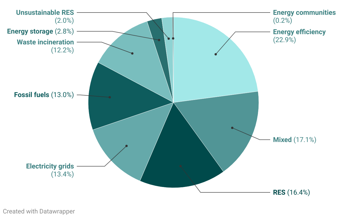 Breakdown of Modernisation Fund financing 2021 to 2024 by investment category share (according to Bankwatch categorisation)