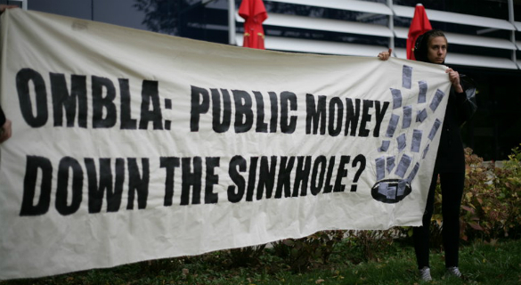 A young woman holding a banner that reads "Ombla: public money down the sinkhole?"