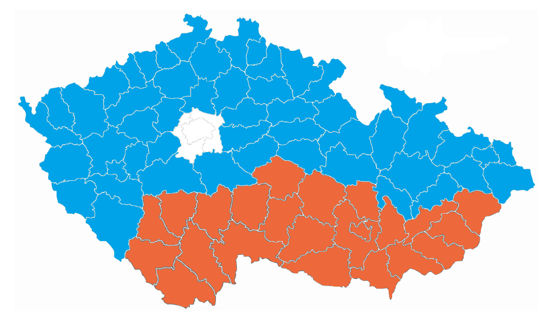 Most Czech power plants are state-owned, led by ČEZ, followed by billionaire Pavel Tykač’s Sev.en, Sokolovská uhelná, and Daniel Křetínský’s EPH. Electricity is distributed to Czech households by three distribution system operators. As shown on the map below, the majority of distribution is handled by a ČEZ subsidiary (in blue), while South Moravia and South Bohemia are administered by EG.D (in red), a private company owned by a foreign national. Prague has its own, indirectly municipally owned PRE distribution network (in white). Energy retailers – around 350 in total – then purchase this electricity and resell it to end users.